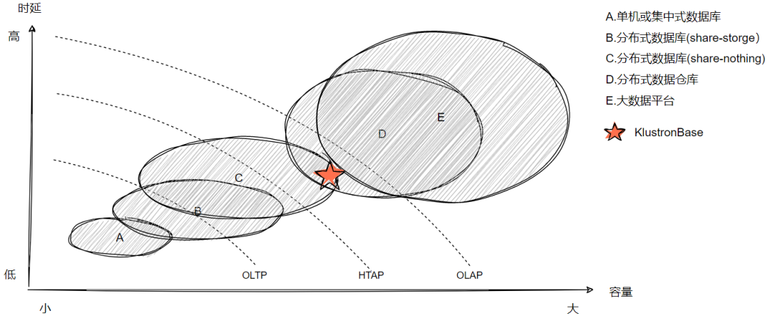 可以说国内分布式数据库非常繁多,如何在众多产品中定位、选择一款产品非常关键。这里通过一张简图进行说明,并尝试将主要技术架构路线覆盖范围及昆仑数据库所在定位进行描述。下图将用户的数据库使用场景,简单从数据容量、响应时长角度进行归类。横轴表示数据容量,越靠右规模越大;纵轴表示响应时延,越靠上时延越高。根据常规的的划分,我们可以将数据使用场景,简单分为 OLTP-联机交易、HTAP-混合负载和 OLAP-联机分析,其对应的数据规模和时延要求各有不同。从主要技术实现路线来看,可大致按照擅长的领域做下划分,如下图。其中会有部分场景上有所交叉。