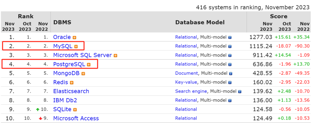 刚开始接触这一数据库产品,给我最大感觉就是其架构特点,它通过将作为流行的两款开源数据库产品组合而成。做数据库的同学都知道,MySQL、PostgreSQL 是全球最为流行的两款开源数据库,在近二、三十年的时间在全球范围内得到了广泛的应用。从下图来自 db-engines 的流行度排名来看,这两款产品排名前五,也是最为流行的开源数据库。